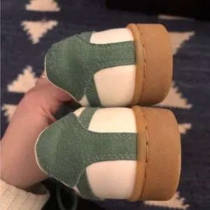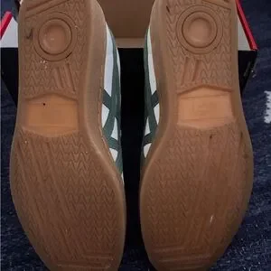 Onitsuka Tiger GSM sneakers in cream leather with deep forest green accents. Low-top sneaker silhouette. Suede and leather mixed upper. Cushioned insole and rubber sole. Classic Onitsuka side stripes. Worn a handful of times; still in perfect condition. Will come with original box.