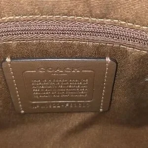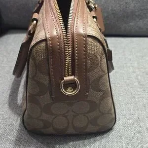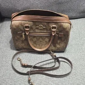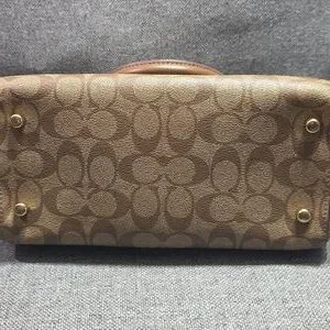 Stylish Coach satchel with signature pattern. Features dual handles and detachable strap. Ideal for versatile use.
