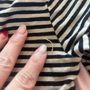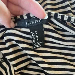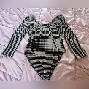 Stylish black and tan striped one piece. 3/4 sleeves. Comfortable fit. Does have tiny snag. See last picture.