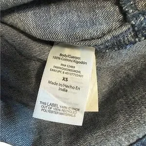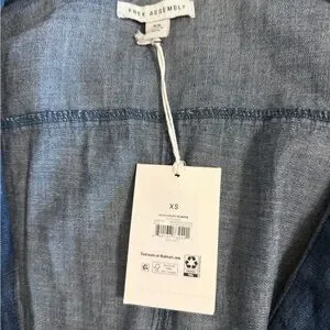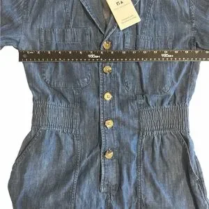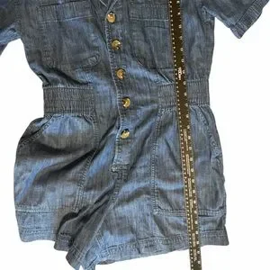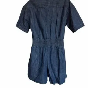 Casual dark blue denim jumpsuit with short sleeves and front button closure. Elasticized waist provides a flattering fit. Functional chest and hip pockets for everyday convenience. Versatile and comfortable for daytime wear.