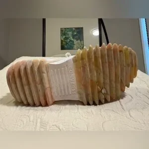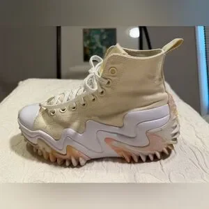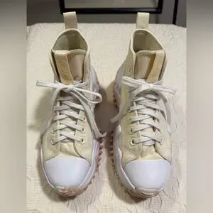 Trendy cream high-tops with unique sole design. Comfortable and stylish for everyday wear.