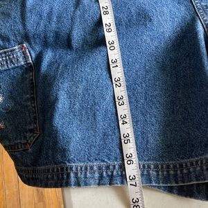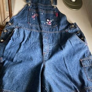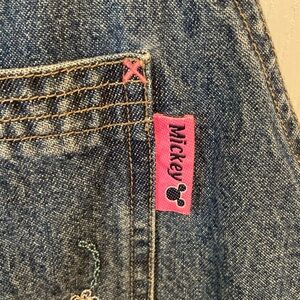 Classic blue denim short overalls featuring embroidered Mickey Mouse and floral accents on the bib. Adjustable shoulder straps and front bib pocket. Side button closures and roomy pockets for play. Casual, durable style for everyday wear.