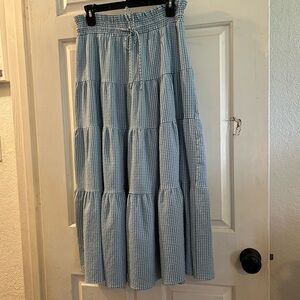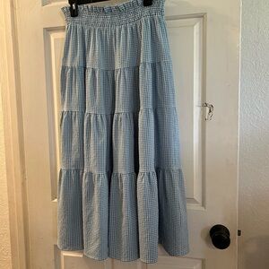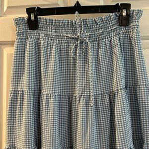 Flowing tiered maxi skirt in light blue gingham. Smocked elastic waistband with drawstring. Soft woven texture and full silhouette. Easy to style for casual looks.NWT