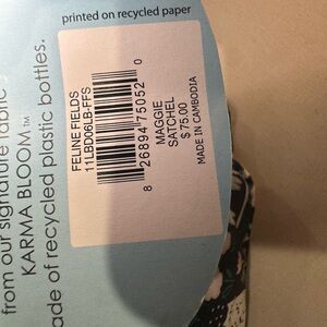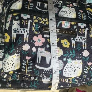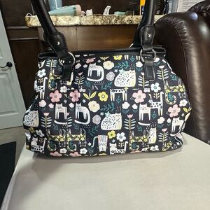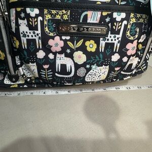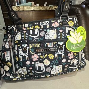 Playful satchel with floral and animal motifs. Black background with yellow, pink, cream, and green details. Sturdy black handles and front zip pocket. Comes with Lily Bloom tag on exterior.