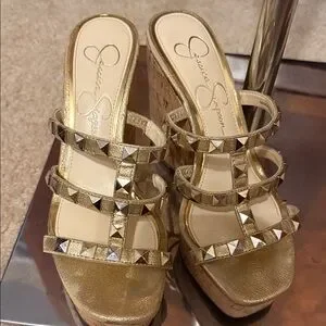 Jessica Simpson wedge sandals in metallic gold with studded straps. Cork wedge heel for a summer-ready vibe. Slip-on design for easy wear. Stylish choice for day or night looks.