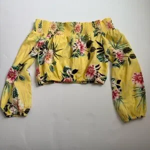 Guess Los Angeles Floral Off Shoulder Crop Top Smocked Yellow Size L NWT