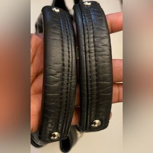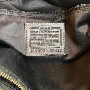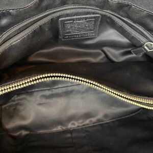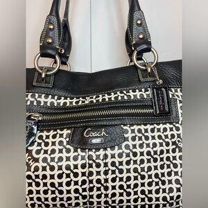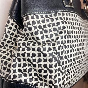 Stylish Coach shoulder bag with iconic pattern. Features black leather accents and secure zip closure. Perfect for everyday elegance.