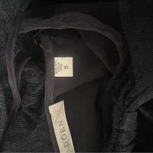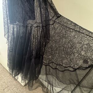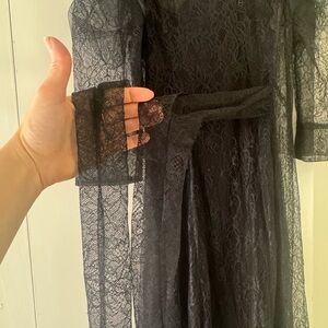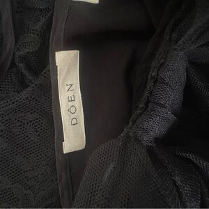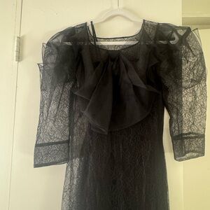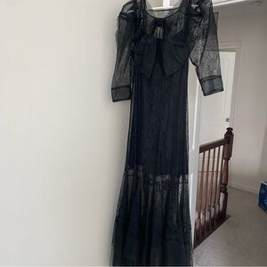 Hauntingly Elegant black maxi dress by Doen. Sheer lace sleeves and paneling. Delicate ruffle and bow detail at the neckline. Fitted through the waist with a flowing skirt. Feminine, romantic silhouette. Reminds me of the dress Veronica Lake wore in “I Married a Witch”