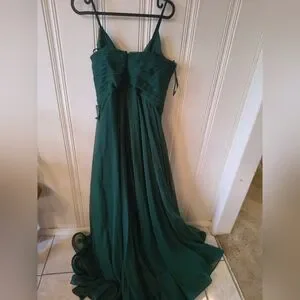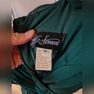 Beautiful La Femme dress. Emerald green color. Size 14. V-neck and pleated bodice. Flowy skirt. Great for formal events or bridesmaid. Made of 100% polyester. Has back zipper closure. Fits like a 10