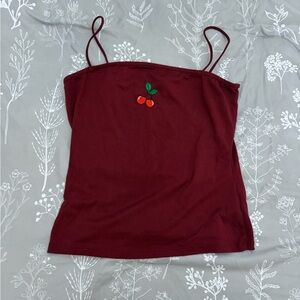 Classic spaghetti-strap cami in deep burgundy with a small cherry embroidery at the chest. Lightweight, soft fabric for comfortable everyday wear. Slim, flattering cut that layers easily under jackets or cardigans. Burgundy hue adds a warm, versatile touch to outfits.