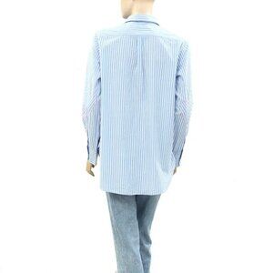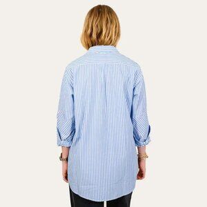 Elevate your wardrobe with this stylish blue striped button down shirt. Perfect for any occasion, this top offers both comfort and elegance.