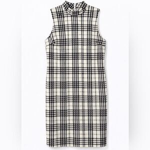 Channel ultimate Dark Academia energy with this timeless plaid mock-neck sheath dress. A quintessential Corpcore staple, this sleeveless silhouette features a sophisticated black-and-white check pattern and a structured mock-neck, leaning into the 1960s Mod revival.