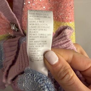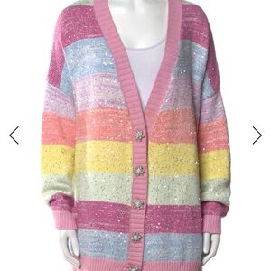 Soft pastel striped cardigan with subtle sequin accents. Features pink trim and button-front closure for easy wear. Lightweight, cozy knit perfect for layering. Adds a playful pastel pop to outfits. Bottom flower is off but snap works