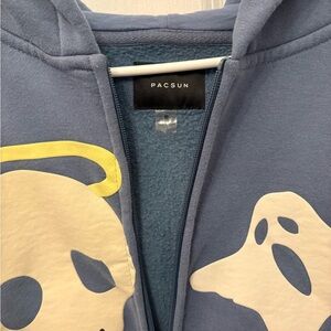 Stylish blue hoodie with bold skull design. Features unique graphic elements. Only worn a few times. Comes from a smoke free pet friendly household