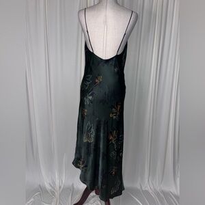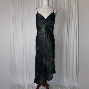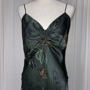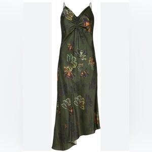 The Alexia Dress by ALLSAINTS. Made from a silk blend fabric, the v-neckline is accentuated with drawstring ruching at the bust. Cut on the bias with an asymmetric hem to give a flattering drape. Completed with autumnal florals - the Lilly print. Spaghetti straps are adjustable. Dress is fully lined.