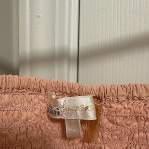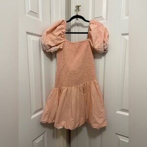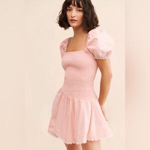 Charming pink dress with smocked bodice and puff sleeves. Features a flared skirt with lace trim. No flaws.
