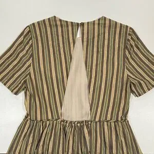 Maxi dress in a multi-color vertical stripe pattern with metallic gold thread accents throughout. This piece features a tiered skirt with trim detailing at the waist and tiers, short sleeves, and a unique open-back design. The lightweight cotton-blend fabric is fully lined at the top and skirt is lined to approximately knee length.