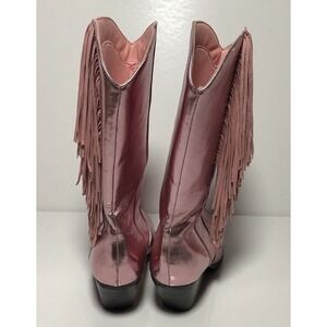 Vintage-style metallic pink Western boots by Billini, model "Andi" — women's size US 9. Shaft height approx 14 inches. Classic Western block heel & pointed toe silhouette with statement fringe detailing.