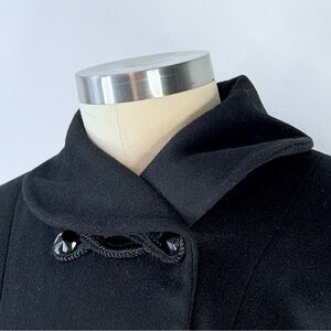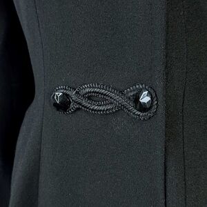 The midnight black wool is accented by four ornate corded frog closures with faceted black buttons, creating an elegant mid-century aesthetic.