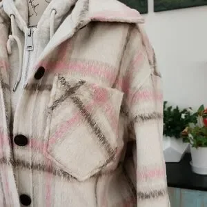 New with tags. 7 For All Mankind plaid shacket duster coat features a removable inner hoodie, left check pocket, two side welt pockets, fully lined, and button closure, as well as a zipped front when the hoodie is connected, back kick pleat (still has tacing in place), and buttoned cuffs.