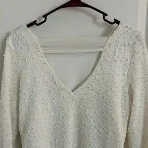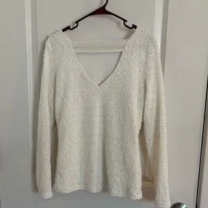 Beautiful Jennifer Lopez textured knit sweater in a soft cream/ivory color with subtle shimmer throughout. Features a flattering V-neckline, long sleeves, and a softly structured silhouette. Elegant texture gives this piece a dressed-up feel while remaining comfortable and versatile.