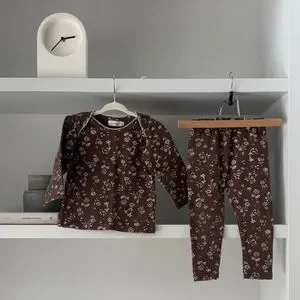 Soft dark brown floral pajama set for kids. Comfortable long-sleeve top and elastic-waist pants for easy wear. Breathable, cozy fabric ideal for bedtime and lounging. Simple, stylish floral print in dark brown.