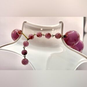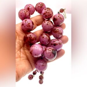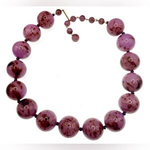 Beautiful vintage large pinkish purple speckled Lucite beaded necklace featuring glossy marbled beads in soft shades with darker speckled accents. The large lucite beads give the necklace a bold, chunky look while remaining comfortable to wear. Hook clasp. 16” with a 4” extension.