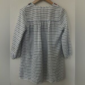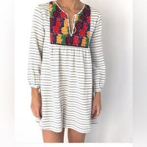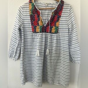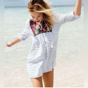 J Crew Striped Beach Tunic. Sz S. Excellent Used Condition. Approx 34” length. Perfect for a day at the beach. Can be worn as dress or a tunic. Blue and white stripes with fun colorful embroidery panel at the neck. Tassel tie at split v back. Long sleeve with elastic cuff. 100% Cotton.