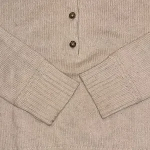 Light cream knit pullover with three-button placket. Round neckline and ribbed cuffs and hem. Easy, versatile layer for everyday wear.
