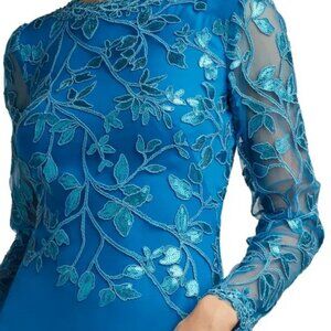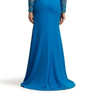 Tadashi Shoji Deep Ocean Blue Sequin Lace Long Sleeve Crepe Gown