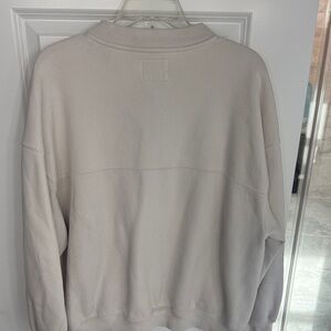 Simple cream bomber jacket with full front zipper. Two front welt pockets. Clean, versatile layering piece. Worn once.