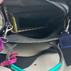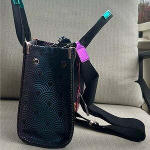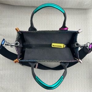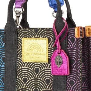 Chic mini tote bags in charcoal grey with multicolor wave-pattern accents. Features a secure zip pocket and tonal interior for organized storage. Sleek design that complements casual and dress looks. Black with pink and gold accent details.