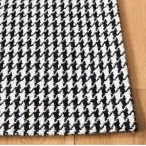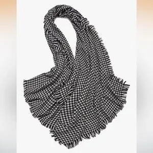 Classic black and white houndstooth scarf with fringe. Soft, versatile layering piece that complements any outfit. Lightweight yet cozy for year-round wear. Easy to style for casual or dress looks.
