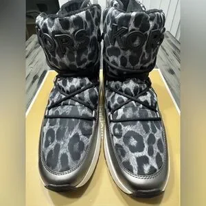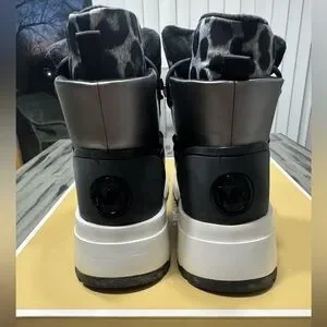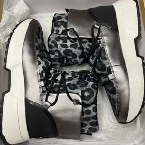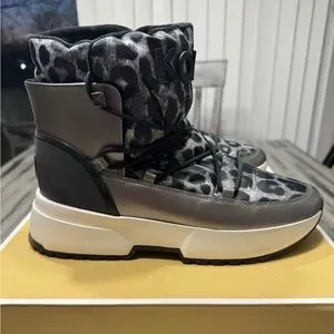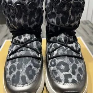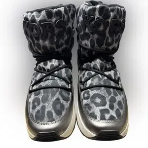 The MICHAEL KORS Cassia Bootie is a stylish, sporty-luxe ankle boot combining cheetah-print nylon with mirror-metallic leather inserts. Designed for winter comfort, these slip-on boots feature a cozy lining and a thick, gripped rubber sole for traction.