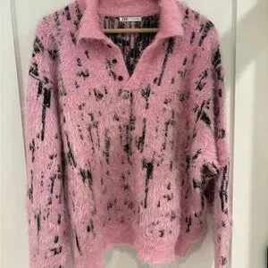 Zara Pink and Black Fuzzy Knit Polo Pullover