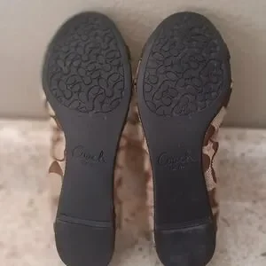 Classic Coach ballet flats in signature canvas. Dark brown leather cap toe with gold-tone buckle detail. Elasticized topline for a snug fit. Neutral tones pair with many outfits.