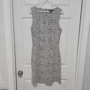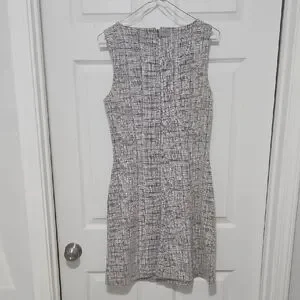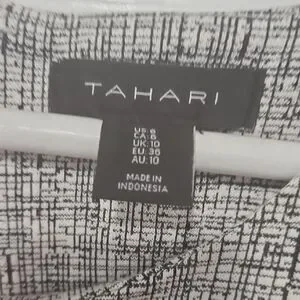 Elegant Tahari midi dress with a monochrome pattern. Sleeveless design for a sleek look.