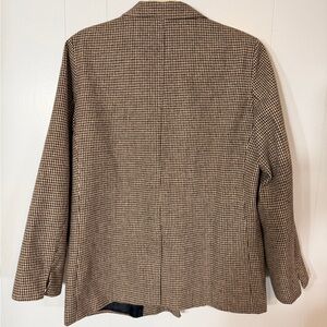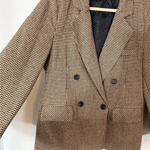 Tailored brown houndstooth blazer with a double-breasted silhouette. Features notch lapels, front flap pockets, and buttoned cuff detail. Versatile brown blazer that layers easily for work or smart-casual looks.