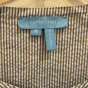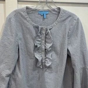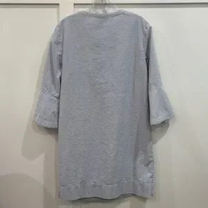 Light blue girls' dress with a ruffle-front detail. Soft seersucker texture for breathable comfort. Three-quarter bell sleeves for a classic silhouette. Easy pull-on style for everyday wear.