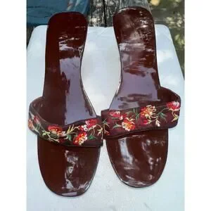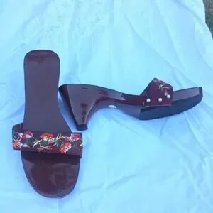 New, unworn slides in glossy burgundy wood with embroidered strap and sculpted heel. Size 7.
