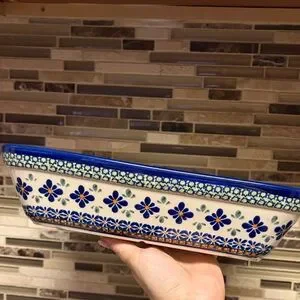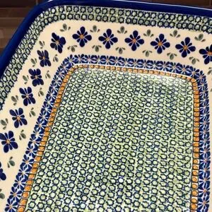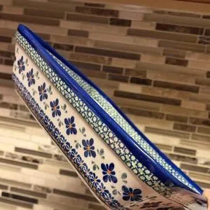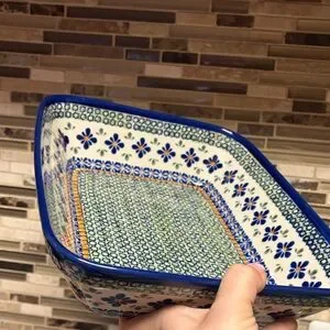 This item is a Blue Rose Polish Pottery rectangular baker in the Mosaic Flower pattern.