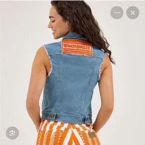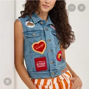Blue denim vest with vibrant patches. Features bold designs and logos. Ideal for casual outings. Worn once.
