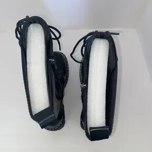 These boots have a vegan leather construction, treaded soles, block heels, side zips, and front lace-up closures