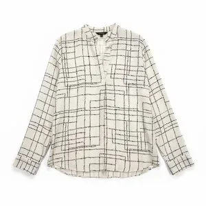 Cream polyester blouse with a scattered black dot-grid print. Lightweight fabric with a soft drape. Simple, versatile pattern for everyday styling.