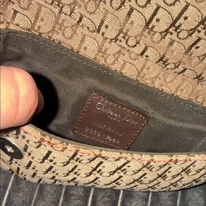 Chic Dior mini bag. Signature pattern. Vibrant red, yellow, and green accents. Stylish and compact.
