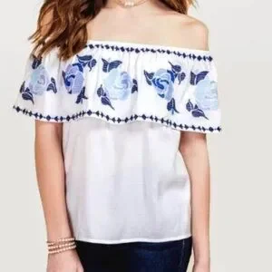 NWT!! Off-shoulder top with embroidered floral yoke. Elasticized neckline for easy wear. Lightweight, breezy fabric. Pairs well with anything. 18.5 inches pit to pit and 20 inches shoulder to hem.