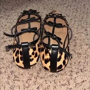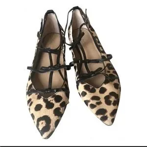 Triple Bow Leopard Print Flats from Banana Republic. These pointed-toe ballet flats are typically crafted from calf hair and feature three distinctive black leather straps with bow detailing across the top.