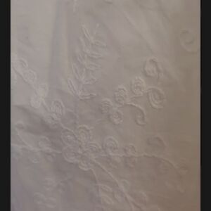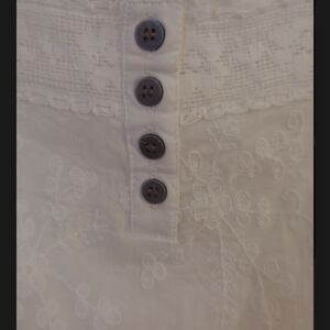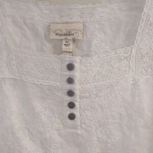 Beautiful white embroidered blouse from Dressbarn featuring delicate floral embroidery and lace trim details. This feminine top has a square neckline with lace accents, a button-front placket, and soft flutter sleeves that create a breezy, romantic silhouette.