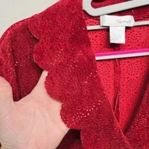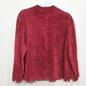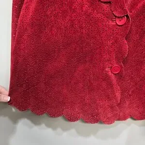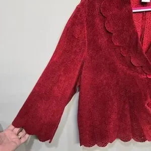 Festival, Whimsigoth, Fairy, Boho, Coquette, Artsy, Art To Wear, Eclectic, Romantic, Dopamine Dressing, Eyelet Suede, Statement Jacket, Eye-Catching, Unique, One Of A Kind, Dainty, Delicate, Lightweight, Breathable, Boho, Bohemian, Gothic, Textured Leather, Bold Red, Dramatic Jacket