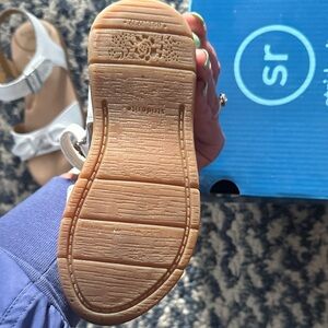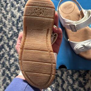 Cute white sandals with decorative bows on the toe straps. Buckle ankle strap adjusts for a secure fit. Padded footbed for gentle comfort during play. Simple style pairs well with dresses or shorts. Box included. Worn less than a handful of times.